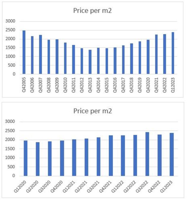 The first graph shows official prices per square metre since 2005, as far back as the government has records. Despite the big crash in 2007/2008, it took another 5 years until prices hit rock bottom in 2013. After that, the increase has been steady. The second graph shows a quarterly trend since the beginning of 2020. Covid caused a slight drop, but it is safe to say that during the second half of that same year and since then prices have been on an upward trend.